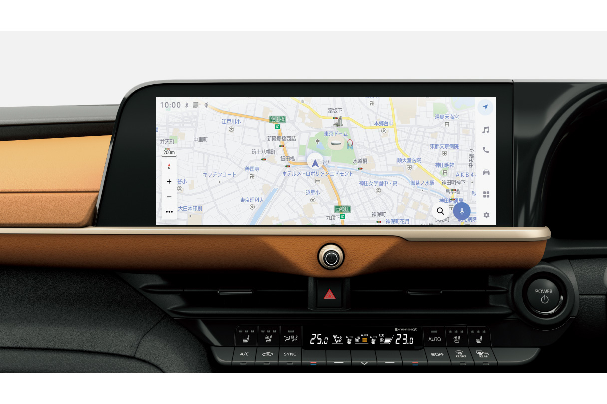 12.3インチの鮮明な地図と高コントラストの美しい映像がご覧いただけます。センター通信型コネクティッドナビの対応に加え、通信が途切れて万一保持する地図情報の外に出てしまった場合でも、続けてナビ機能が利用できる車載ナビ機能も搭載しています。
