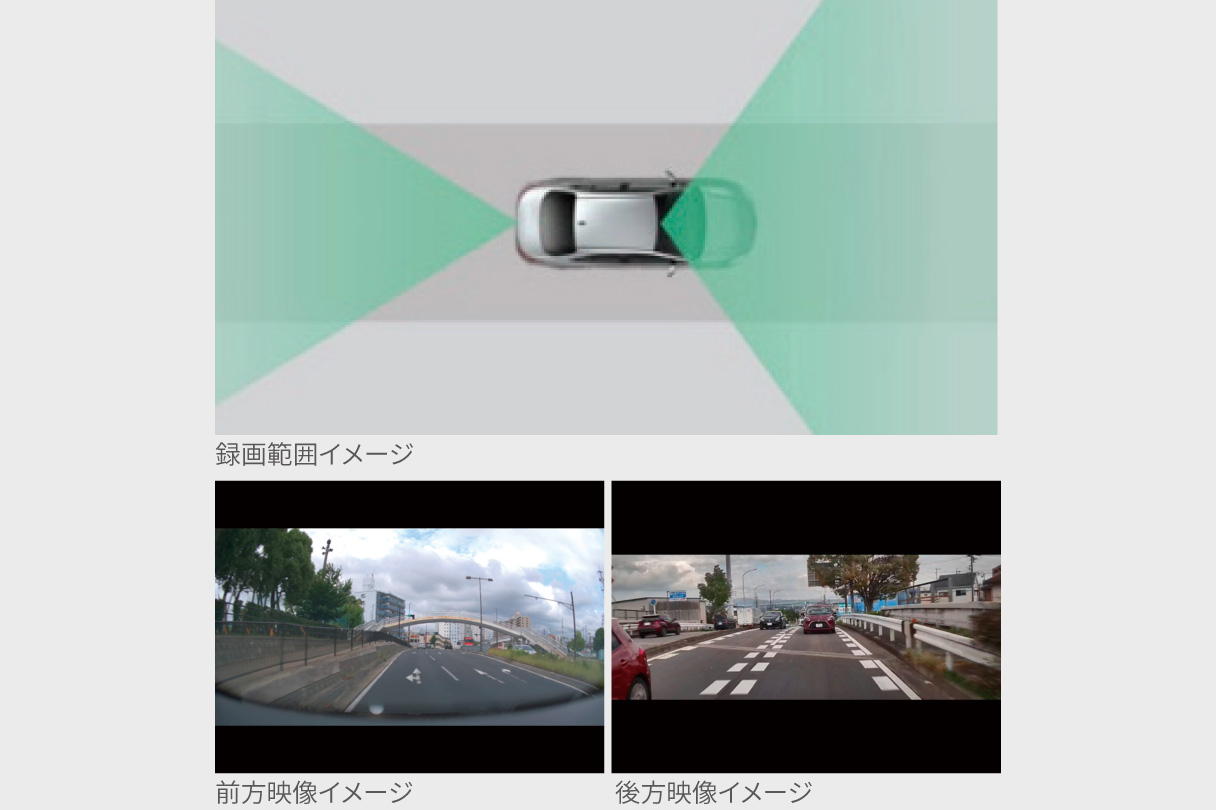 ■ドライブレコーダー(前後方)は事故の検証に役立つことを目的の一つとした製品ですが、証拠としての効力を保証するものではありません。 ■映像が録画されなかった場合や録画されたファイルが破損していた場合による損害、故障や使用によって生じた損害については、弊社は一切責任を負いません。 ■録画した映像は、その使用目的や使用方法によっては、被写体のプライバシーなどの権利を侵害する場合がありますのでご注意ください。また、イタズラなどの目的では使用しないでください。これらの場合については弊社は一切責任を負いません。 ■詳細については取扱説明書をご覧ください。 ■機能 画角(水平):前方108°/後方62° 録画画素数:前方200万画素(上下に黒帯が記録されるため、実映像は約180万画素となります。)/後方200万画素(上下に黒帯が記録されるため、実映像は約130万画素となります。) ■画像のカメラ範囲はイメージです。 ■Wi-Fi®は、Wi-Fi Allianceの登録商標です。 ■イラストは作動イメージです。